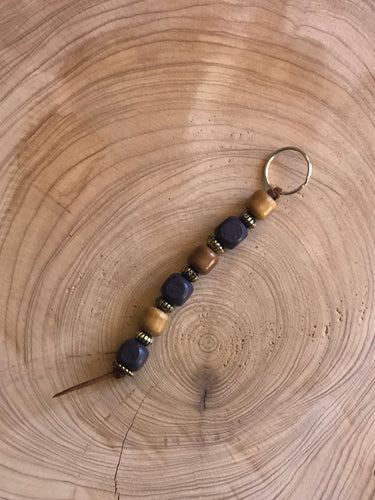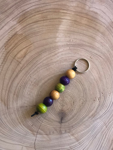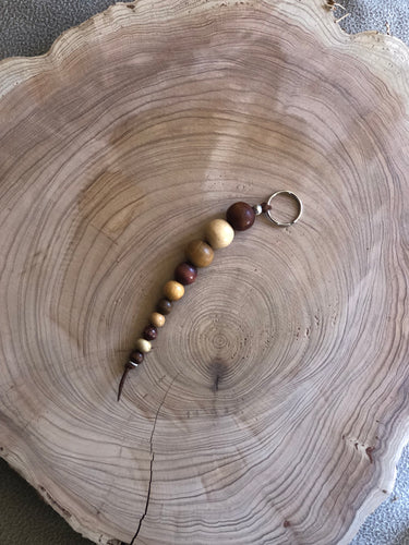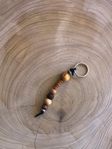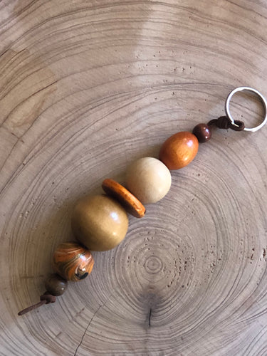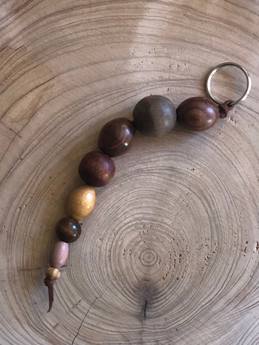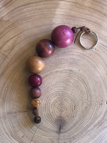 Keyring with textured wooden beads on faux suede cord with split ring.